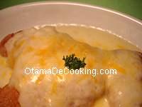 耐熱皿に盛り付けた鶏肉にステップ のソースをかけ、モザレラチーズ、チェダーチーズをまぶしチーズがとけるまでオーブンレンジで焼きます。 |