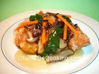 鶏のから揚げ又は竜田揚げに片栗粉でとろみをつけた野菜あんかけをかけます。