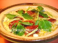 残りの溶き卵を回しいれて、三つ葉をちらし再びふたをして2-30秒煮て火を止めて蒸し煮にします。 |