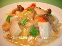 ご飯に、八宝菜をのせたのが中華丼。白菜を中心に、いろいろな野菜を入れて楽しめます。肉を使わず、海老、帆立、カニ等を使えば海鮮中華丼です。