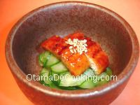 Pour the vinegar sauce over the unagi and cucumber. |