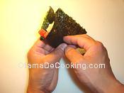 Cut Yaki-Nori (roasted sea weed) in half parallel to the line. |