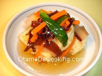 水切りした豆腐を揚げて、野菜あんかけを作ります。今回は、人参、タケノコ、椎茸、チンゲン菜を使ってみましたが、使用する野菜を代えるだけでまた違った味になります。 |